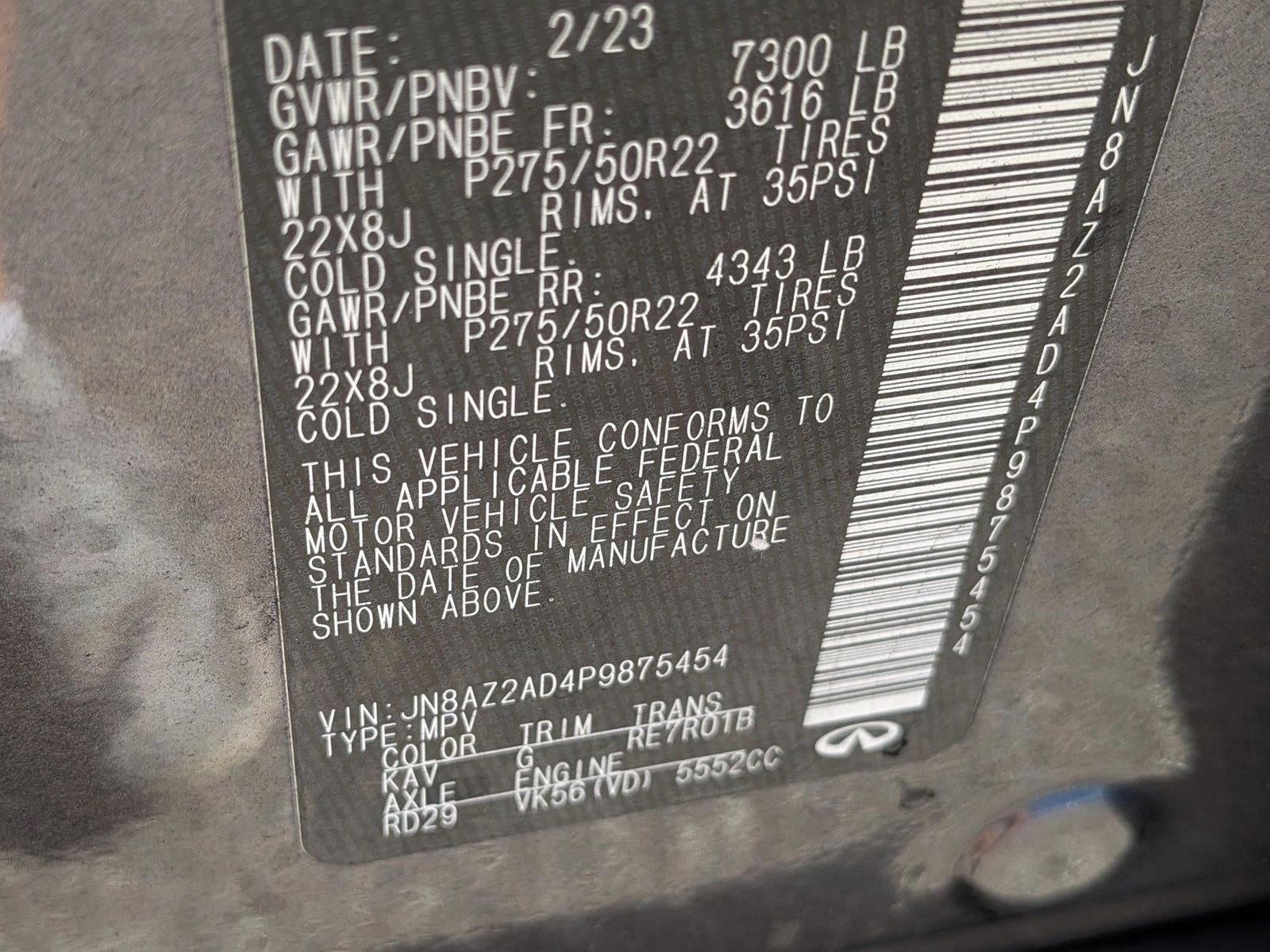 Check out this pre-owned 2023 INFINITI QX80 we recently got in. A test drive can only tell you so much. Get all the info when you purchase a vehicle like this with a CARFAX one-owner report. Do so much more with one vehicle. This INFINITI QX80 gives you everything you need an automobile to be. You deserve a vehicle designed for higher expectations. This INFINITI QX80 PREMIUM SELECT delivers with a luxurious, well-appointed interior and world-class engineering. Exceptional in every sense of the word, this incredibly low mileage vehicle is one of a kind. Marked by excellent quality and features with unmistakable refined leather interior that added value and class to the INFINITI QX80 PREMIUM SELECT. This INFINITI QX80 offers the most up-to-date navigation system available so you'll always know the most efficient route to where you are going. How often was the oil changed? Were important service intervals taken care of? You'll have the records on this vehicles to know for sure. Looking for a INFINITI QX80 that is in great condition inside and out? Take a look at this beauty. When this vehicle was shipped from the factory, INFINITI decided that no option should be left off of this magnificent automobile. So, if you're in the market for a INFINITI QX80 PREMIUM SELECT that is equipped with copious amounts of options, then we may just have the perfect vehicle to suit your needs. One of the things that makes this vehicle a great buy is it has brand new tires.